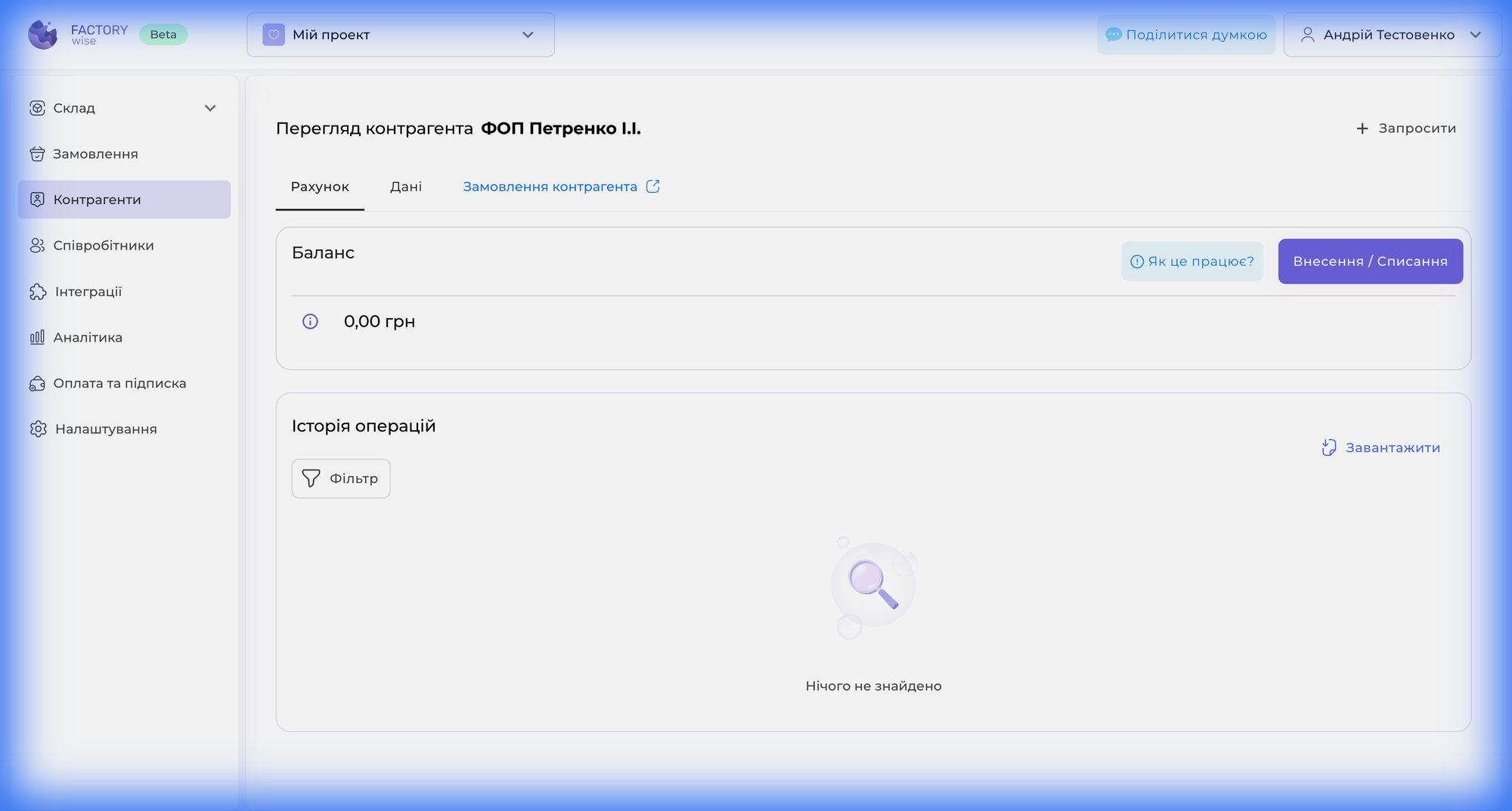 Перейдіть на сторінку створеного контрагента. Тут відображатиметься його поточний баланс, контактні дані та майбутня історія всіх замовлень і транзакцій.