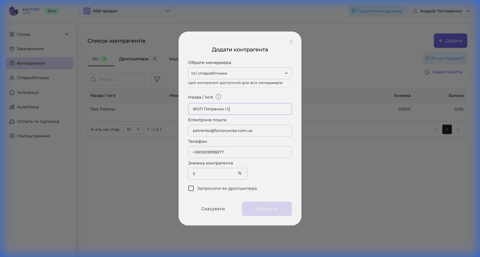 Контрагенти у FactoryWise — це ваші партнери: дропшипери, постачальники сировини або оптові клієнти. Створення профілю партнера — це база для порядку в замовленнях та прозорих взаєморозрахунків.
